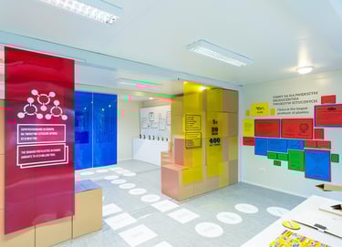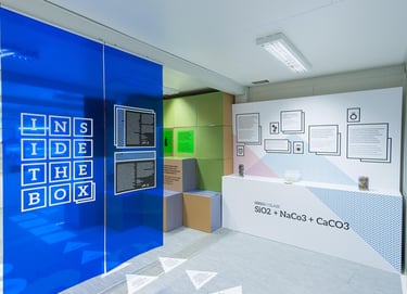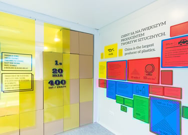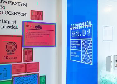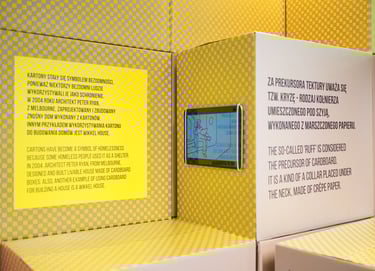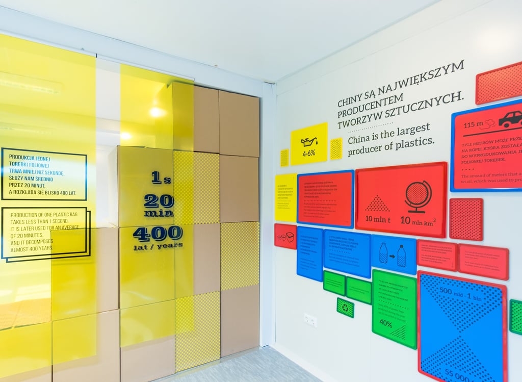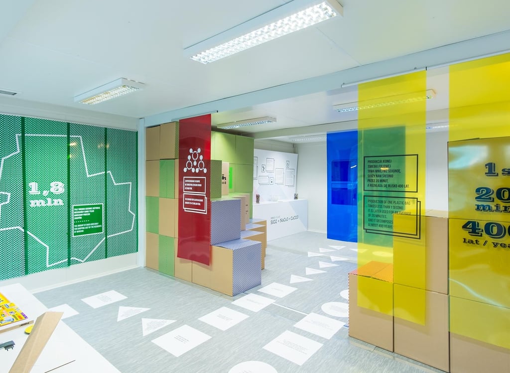 The task was to develop an exhibition arrangement presenting an overview of packaging knowledge. The materials used - cardboard, foil, foam - and a wide range of colors served to show both - the fascinating diversity of the world of packaging and the dangers that this branch of industry creates for the environment.