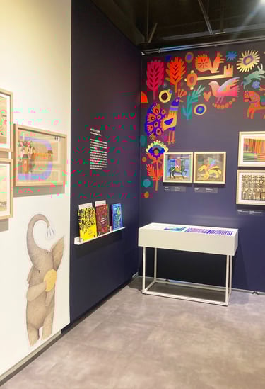 The bright, white space creates a neutral backdrop that enlivens the large-format, colorful graphic application on the wall. Its simplified forms and intense colors echo the work of Polish artists known for their characteristic, joyful lines and expressive hues in children's illustrations, which were featured in the exhibition. The horizontal composition of this graphic forms a visual narrative, typical of storytelling in picture books.