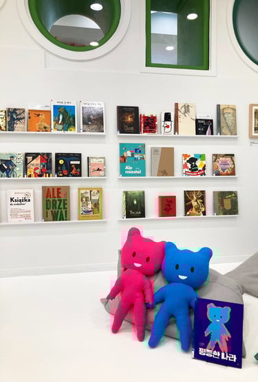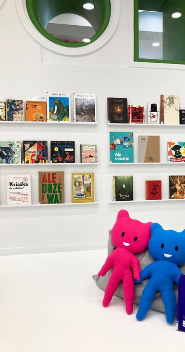 The relaxation zone with soft poufs in shades of green and gray, complemented by displayed Polish illustrated books, serves as a cozy reading corner. The availability of publications encourages visitors to engage more closely with Polish illustration. Decorative elements, such as plush figures, create a more personal and emotional connection with the presented art.