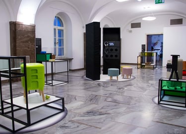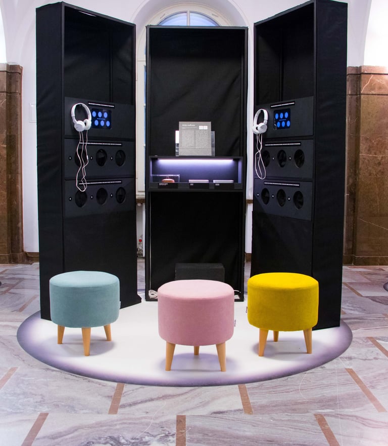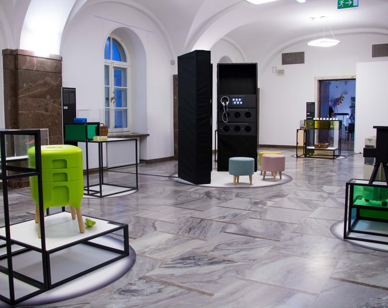 The objects representing various branches of everyday life were exhibited on transparent display polyhedrons underlining the three-level structure of the exhibition. The heart of the exhibition was a sensoric tube – a place for direct interaction with various elements present in the exhibition and for multimedia.