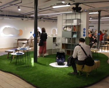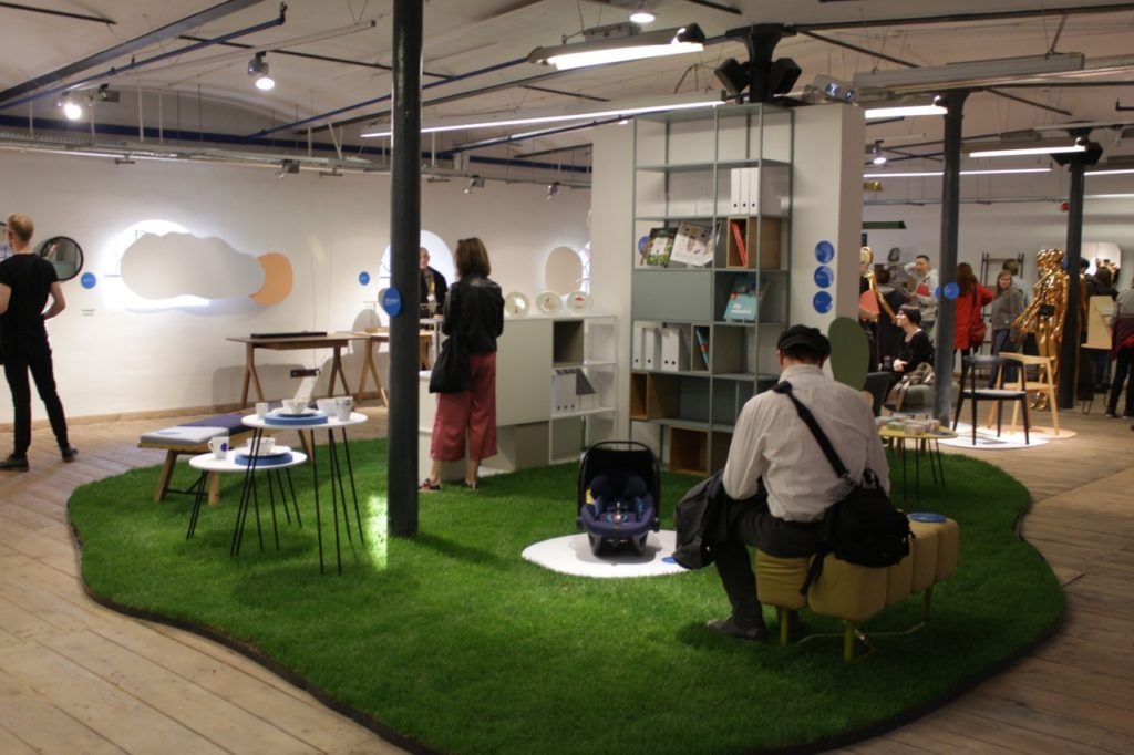 This exhibition showcases innovative design concepts in a repurposed industrial space featuring exposed ceiling infrastructure and wooden plank flooring. The central organizing element is a striking artificial turf installation that creates distinctive green "islands" throughout the gallery, providing a vivid contrast to the raw architectural elements.
