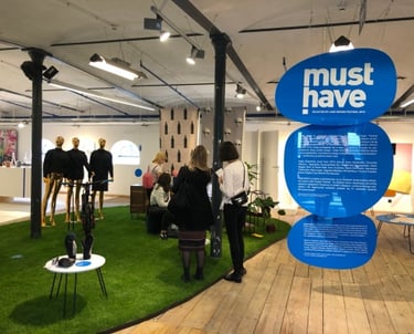 The exhibition incorporates playful visual elements including cloud-shaped wall displays with integrated lighting and bold blue circular information panels branded with "must have" messaging. These informational elements guide visitors through the conceptual framework of the exhibition.