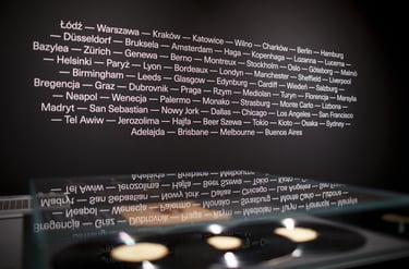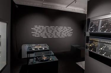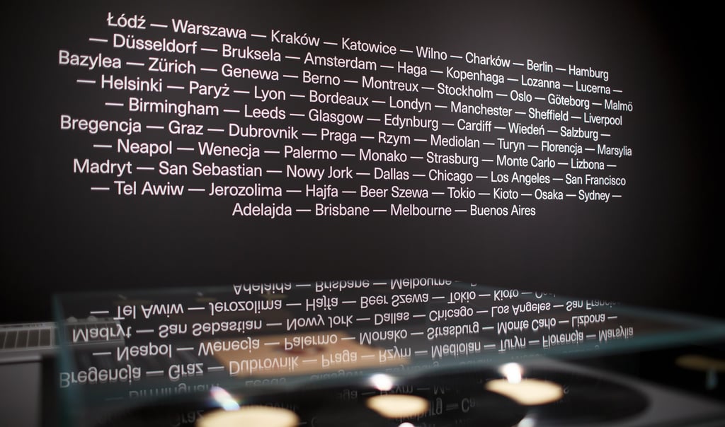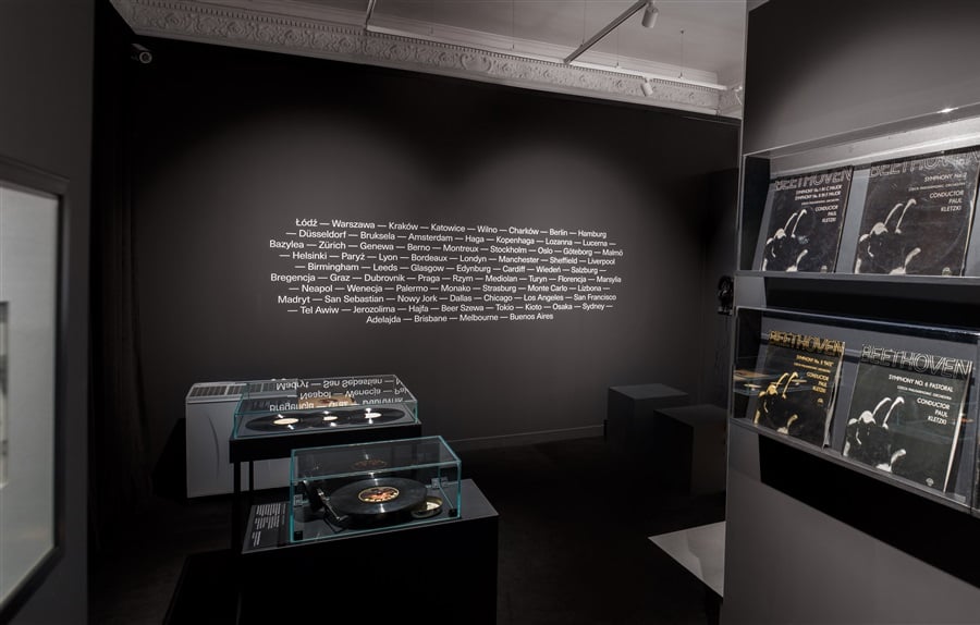 One of the spaces is dedicated to the artist's musical legacy, showcasing a collection of records and recordings that document his activity as a conductor. Another part of the exhibition presents a list of cities, illustrating the international scope of his career – from both Americas through the Middle East to Japan and Australia.