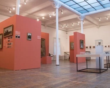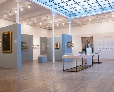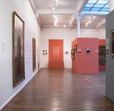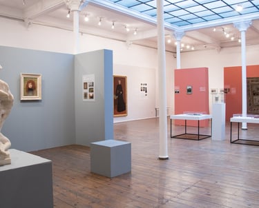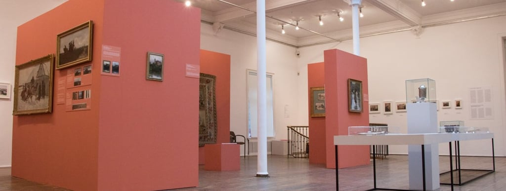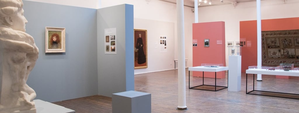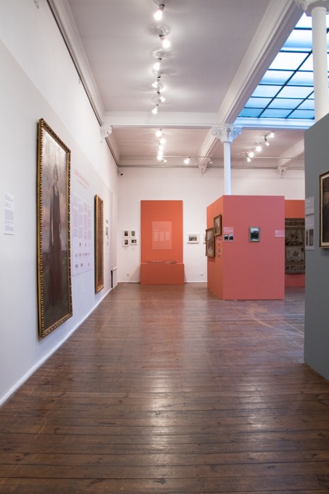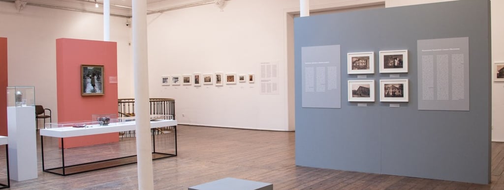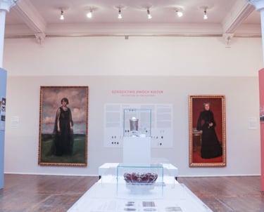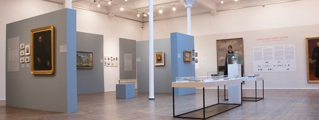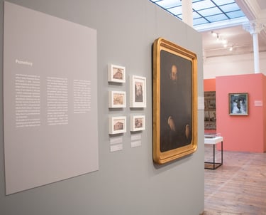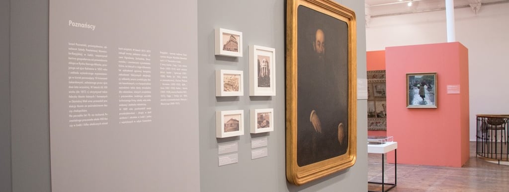 The exhibition of a collection of paintings from the collections of the Poznański and Silberstein families was arranged as a symmetrical space divided into two parts. We used two separate colors to distinguish them – light red and light blue. Seventeen valuable artistic and historical works of art (painting, sculpture, textiles, artistic craftsmanship from the 19th and first half of the twentieth century) were presented at the exhibition by outstanding Polish artists, including Józef Chełmoński, Olga Boznańska and Julian Fałat, as well as authors associated with Łódź - Artur Szyk, Samuel Hirszenberg and Henryk Glicenstein.